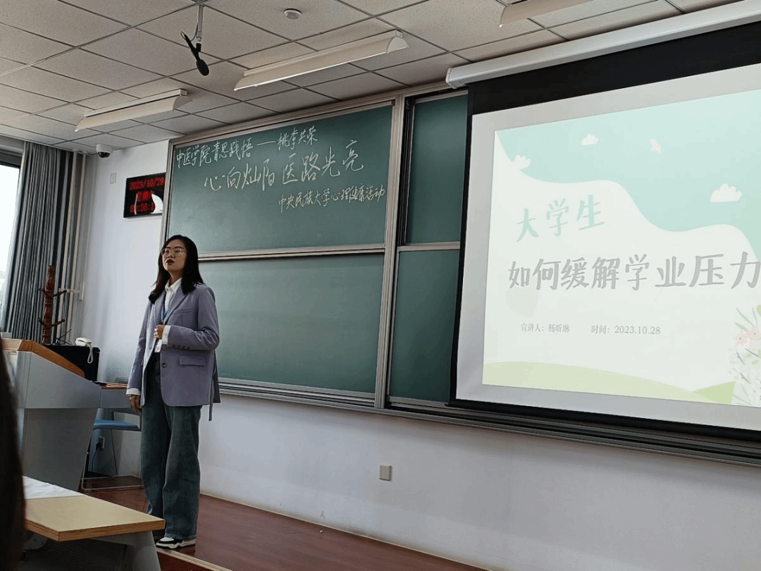 公司志愿者2023级心理健康教育专业杨昕琳同学围绕“老员工如何缓解学业压力”,向北中医现场参会的同学们深入剖析学业压力的定义、来源及影响,并介绍了目标设定和时间管理(SMART原则)等管理学业压力的方法。同学们积极参与互动,现场氛围轻松愉快。