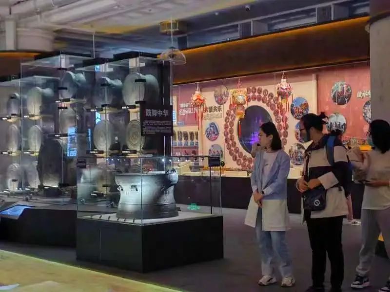 第二单元“大交融”的讲解员刘瑞婷围绕“文化上的兼收并蓄”“经济上的相互依存”“情感上的相互联系”三个方面,来展现中华民族是如何在交往交流交融的过程中发展壮大。在这过程中,讲解员向参观者介绍了古籍、民族乐器、民族服饰、礼仪习俗等,让参观者对中华民族共同体有更深入的了解。讲解员还向观众介绍互动专区“铜鼓同心圆”的设计灵感来源于习近平总书记关于中华民族大团结、同心圆的重要论述,每一圈鼓面上有十二生肖等各民族共有共享的中华文化符号。每当观众触碰鼓面时,同心圆便会变幻出绚烂色彩,播放出各族人民耳熟能详的歌曲,象征着各族人民同心同德,永远紧密地团结在党中央周围。