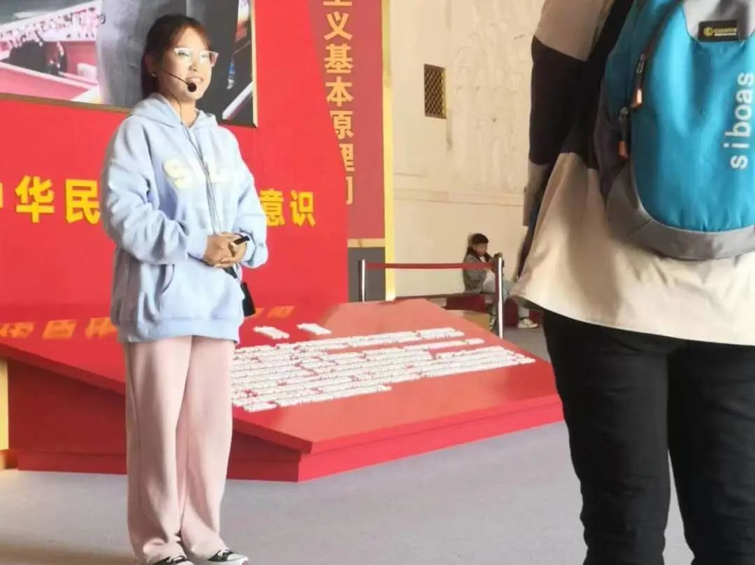 谈球吧官方网站2名2023级本科生作为讲解志愿者,参与到了此次“铸牢中华民族共同体意识文物古籍展”的讲解工作中。第一单元“大一统”的讲解员扎西卓玛主要从思想理念、制度实践和价值追求三个维度来讲述中华民族延续不断的历史故事。此外,这一单元设有互动专区——花瓣古籍墙,整面墙以花瓣为造型寓意着“中华民族多元一体”,部分花瓣上设有机关,摁一下可以打开一个小书盒,里边摆放着珍藏的古籍。在讲解员绘声绘色的讲解中,古籍中承载的中华民族共同体形成发展的历史娓娓道来。