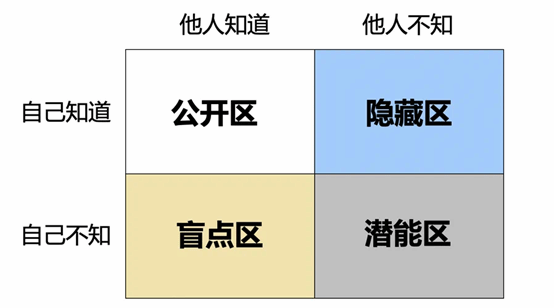 乔哈里视窗 (Johari Window)是一种沟通的技巧和理论,也被称为“自我意识的发现——反馈模型”。它被分为4个区域:公开区、隐藏区、盲点区、潜能区。四个区域的动态变化可以用来增进个人的自我意识, 也可以促进人际间的有效沟通。