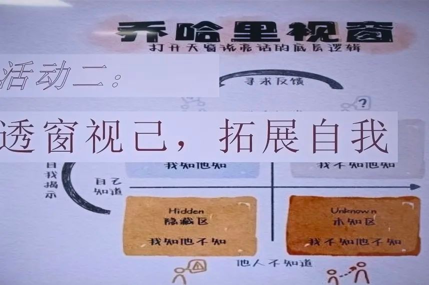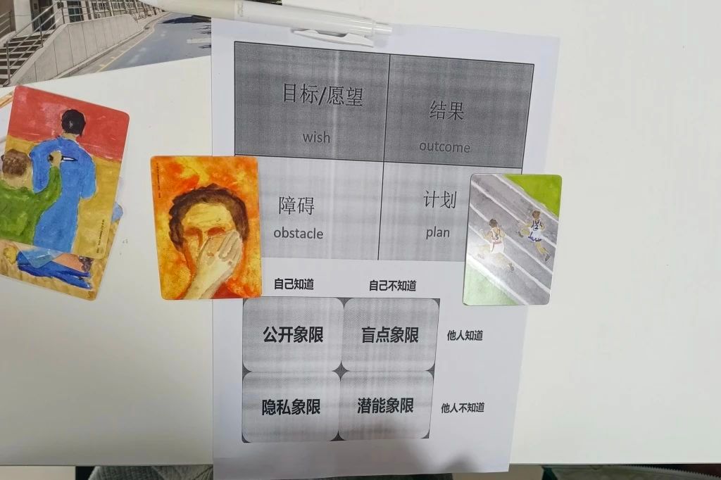 第二环节中,同学们抽取四张卡牌并将其置于乔哈里视窗方格内,通过四个象限的引导去发现了他人眼中或者无人发现的内心深处的自我。多张“OH”卡和乔哈里视窗方格帮助同学们对自我潜能与内心深处有了更清晰的认识与了解,也在交流过程中表达自己、了解他人。