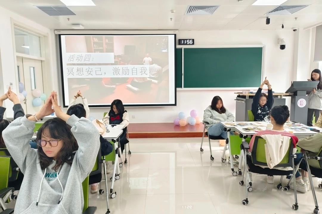 第四环节中,同学们跟着活动主持人冥想词的引导,伴着缓和的音乐放松自己。静静的水边,生命之树葳蕤生长,随风飘动。感受生命的力量从脚底灌注周身,体会到内心的宁静,发现自己内在蕴藏的无限能量,语言与音乐的融合,使文字变成开启心灵的钥匙。同学们就在人与自然的共鸣中,打开自我、回归原点、感受心底的平静。