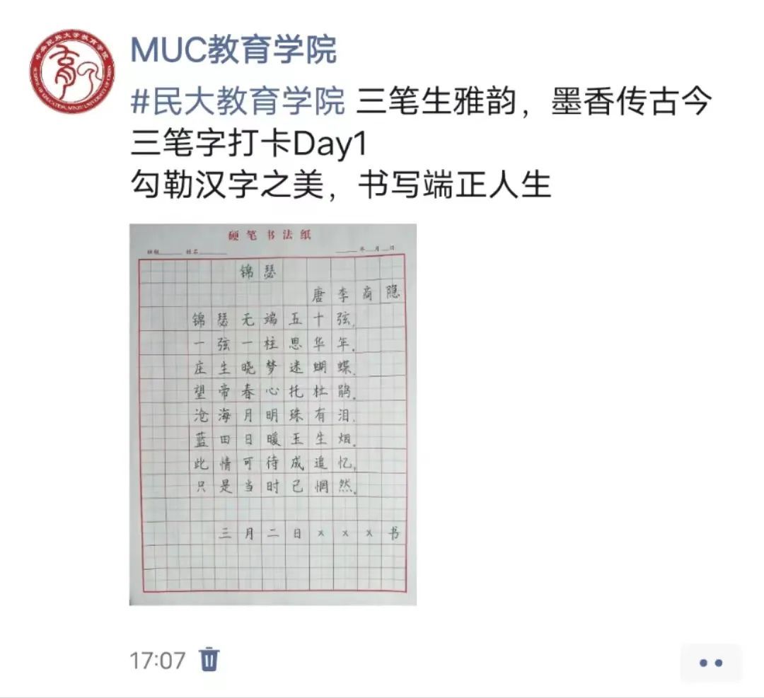 2. 将作品照片和朋友圈截图于每晚23:00前上传至微信小程序进行打卡。其中朋友圈打卡格式为:#民大谈球吧官方网站 三笔生雅韵-墨香传古今+三笔字打卡DayX+当日心得。工作人员每7天会在活动群内公示一次打卡情况。