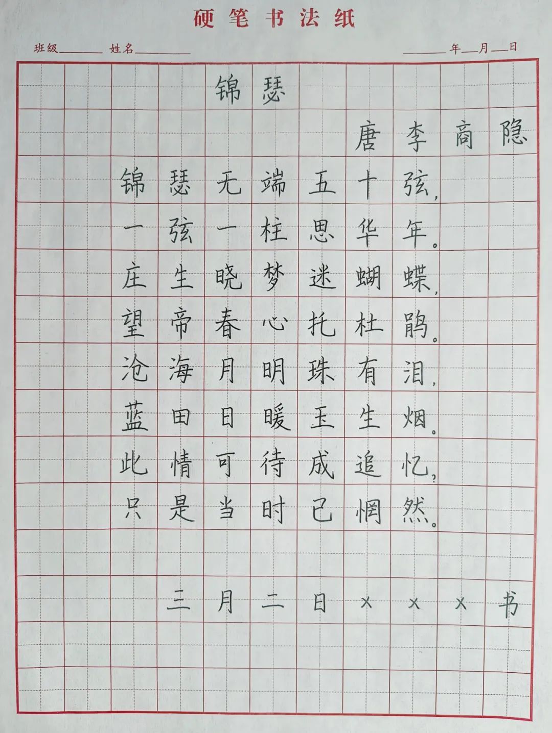 本次打卡活动共有三个项目,“硬笔字”“粉笔字”和“毛笔字”分别打卡7天,其中硬笔字、粉笔字作品必须以楷书字体书写,毛笔字则不限字体;书写内容需为教育名篇或部编版语文教材必背古诗文;硬笔字每天打卡需不少于60字,粉笔字需不少于30字,毛笔字需不少于20字。坚持完成21天打卡且质量过关的同学可获得院级活动证明,优秀三笔字作品还将有机会在谈球吧官方网站官方公众号上进行全院展示。