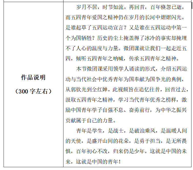 以文件夹压缩包形式提交,压缩包内包括视频作品、逐字稿和300字左右的作品说明(示例如下)。
