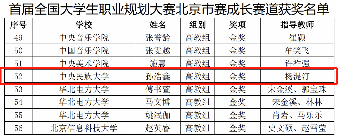 谈球吧官方网站2021级本科生孙浩鑫获首届全国老员工职业规划大赛北京市赛高教组金奖,杨湜汀老师获优秀指导教师称号。