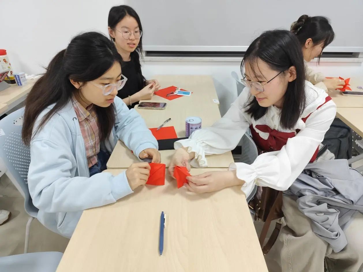 同学们在纸上写下美好祝愿或“三月三”文化知识、心理健康相关知识,再通过灵巧的双手折叠出鲜红夺目的石榴花。这些石榴花不仅展现了同学们的巧思和手艺,更传递了内心的美好和祝福。在这个过程中,大家不仅学习并了解了传统节日和心理健康的相关知识,还感受到了传统文化的魅力。
