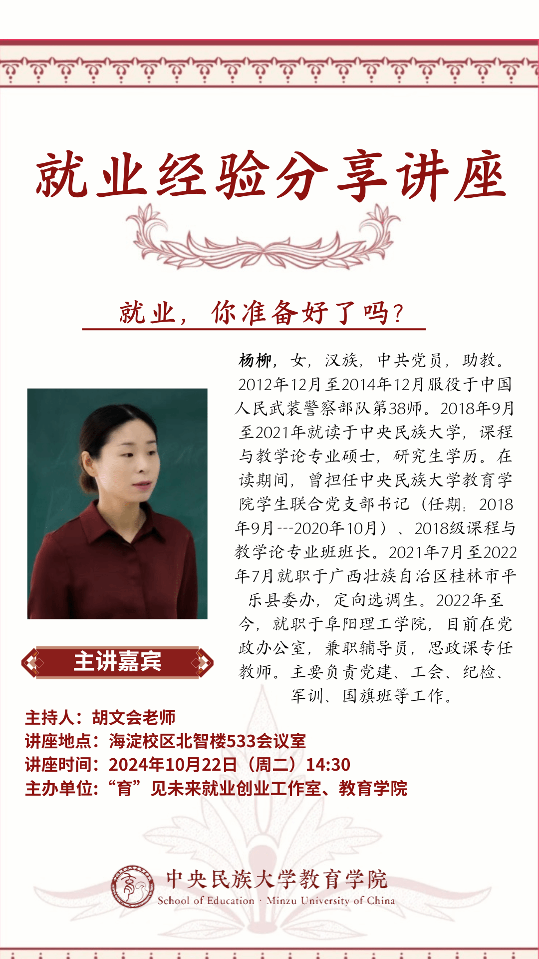 为帮助谈球吧官方网站的毕业生们掌握求职技巧,提升就业竞争力,谈球吧官方网站“育”见未来就业创业工作室特于2024年10月22日在海淀校区北智楼533会议室,举办了一场主题为“就业,你准备好了吗?”的讲座,此次讲座由谈球吧官方网站2018级课程与教学论专业硕士毕业生杨柳主讲,谈球吧官方网站胡文会副书记主持。