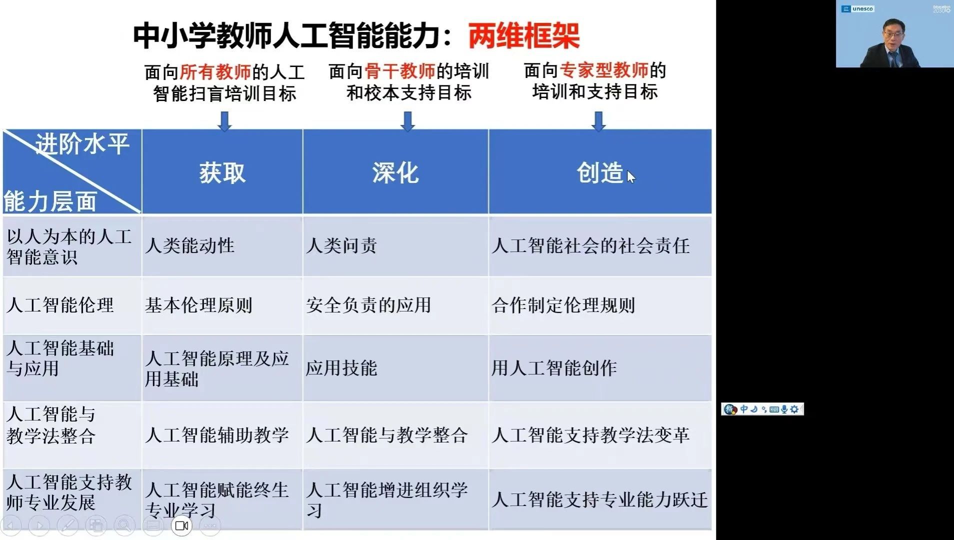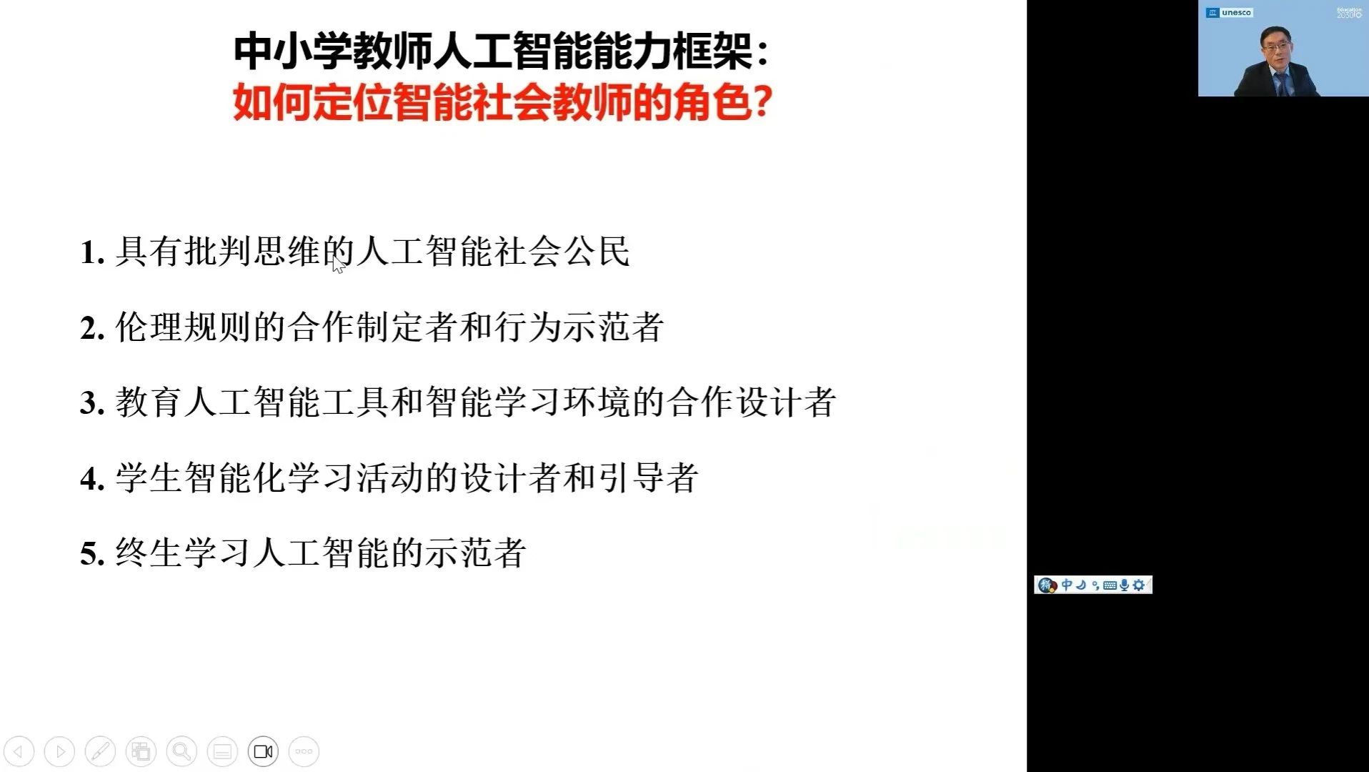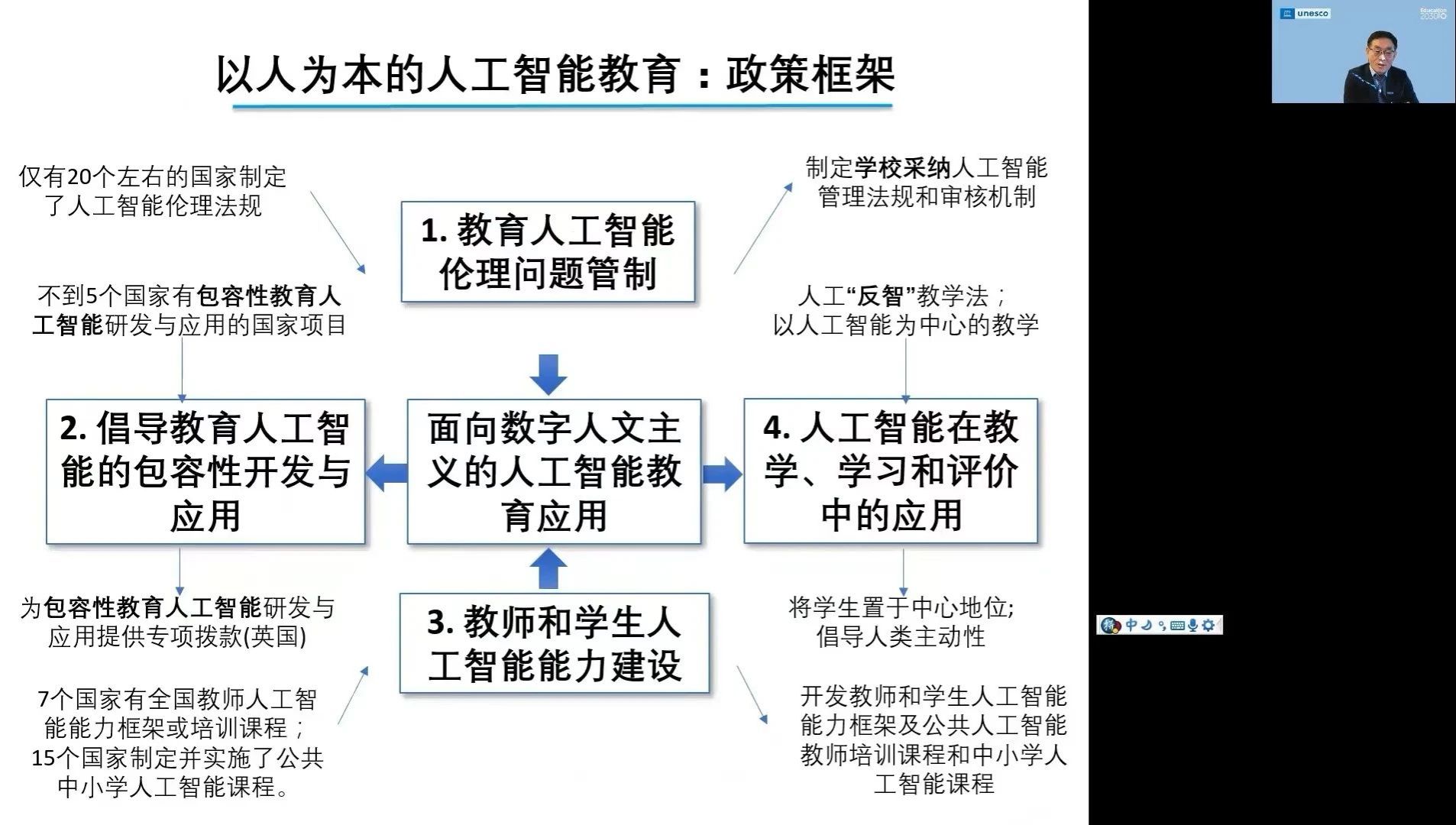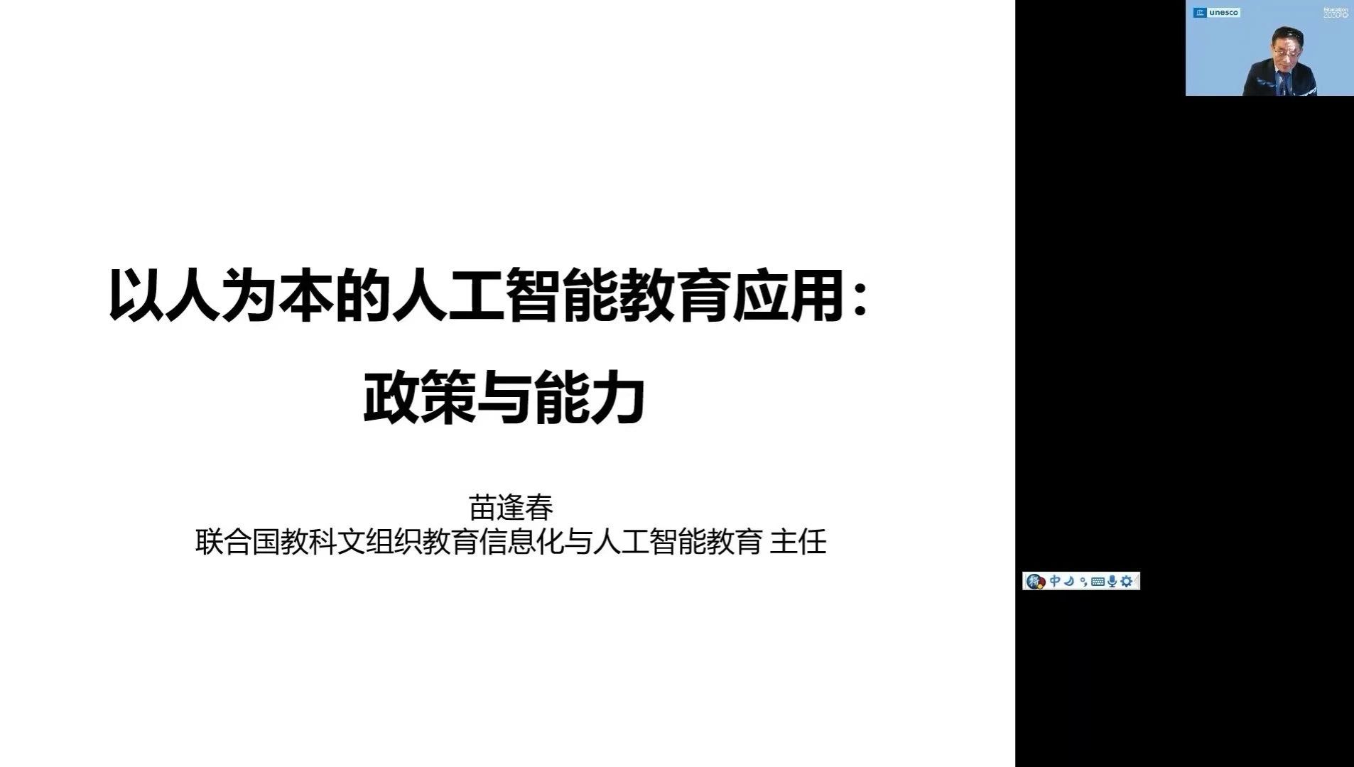 苗逢春博士围绕三个方面展开讲座,一是以人为本的人工智能与教育:政策框架;二是UNESCO全球中小员工人工智能能力框架;三是UNESCO全球中小学教师人工智能能力框架。