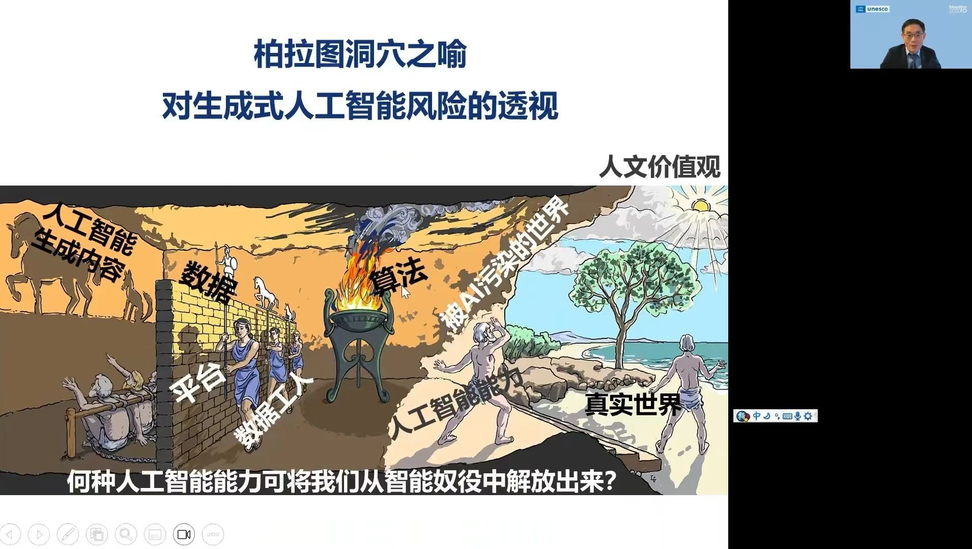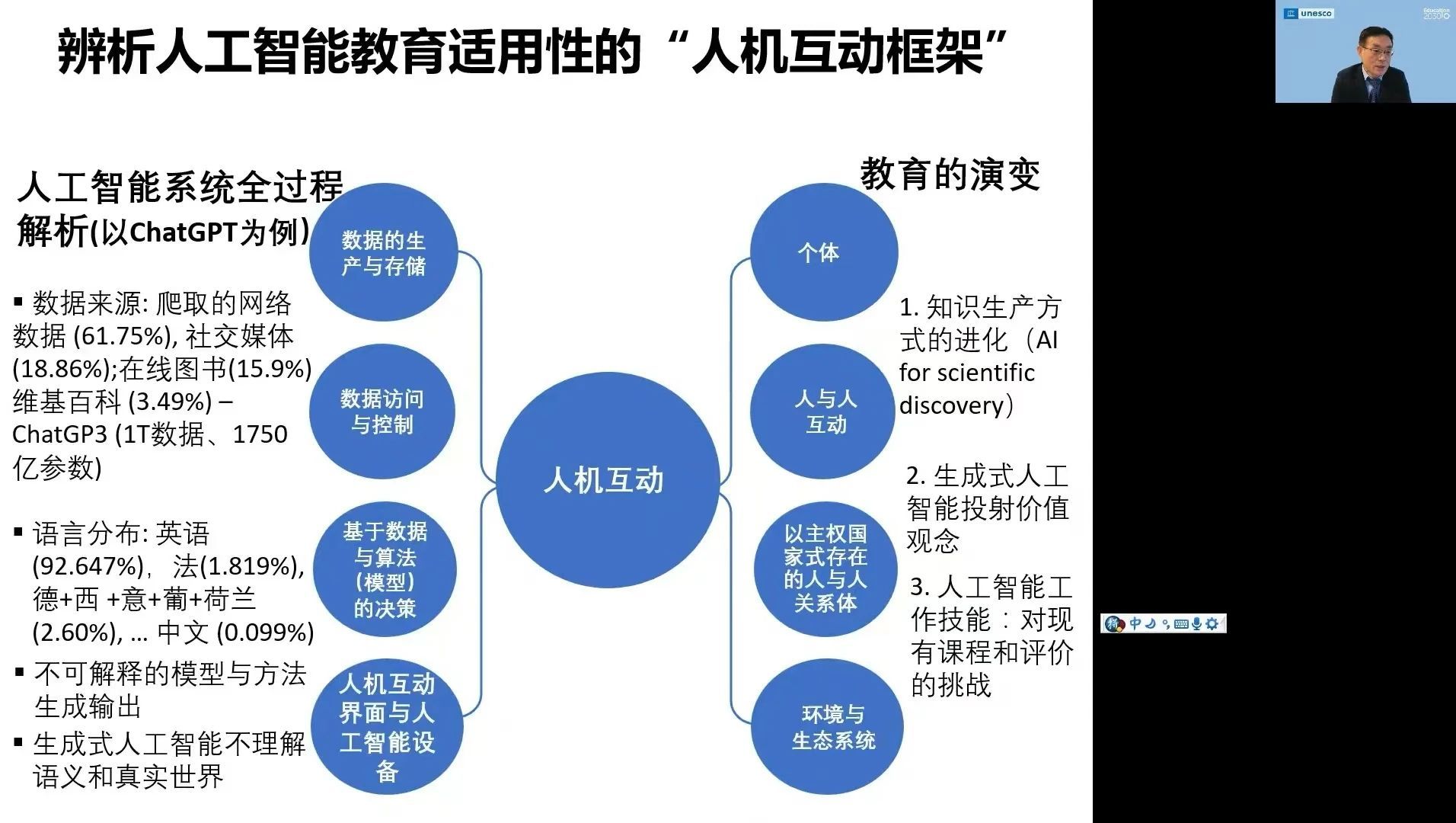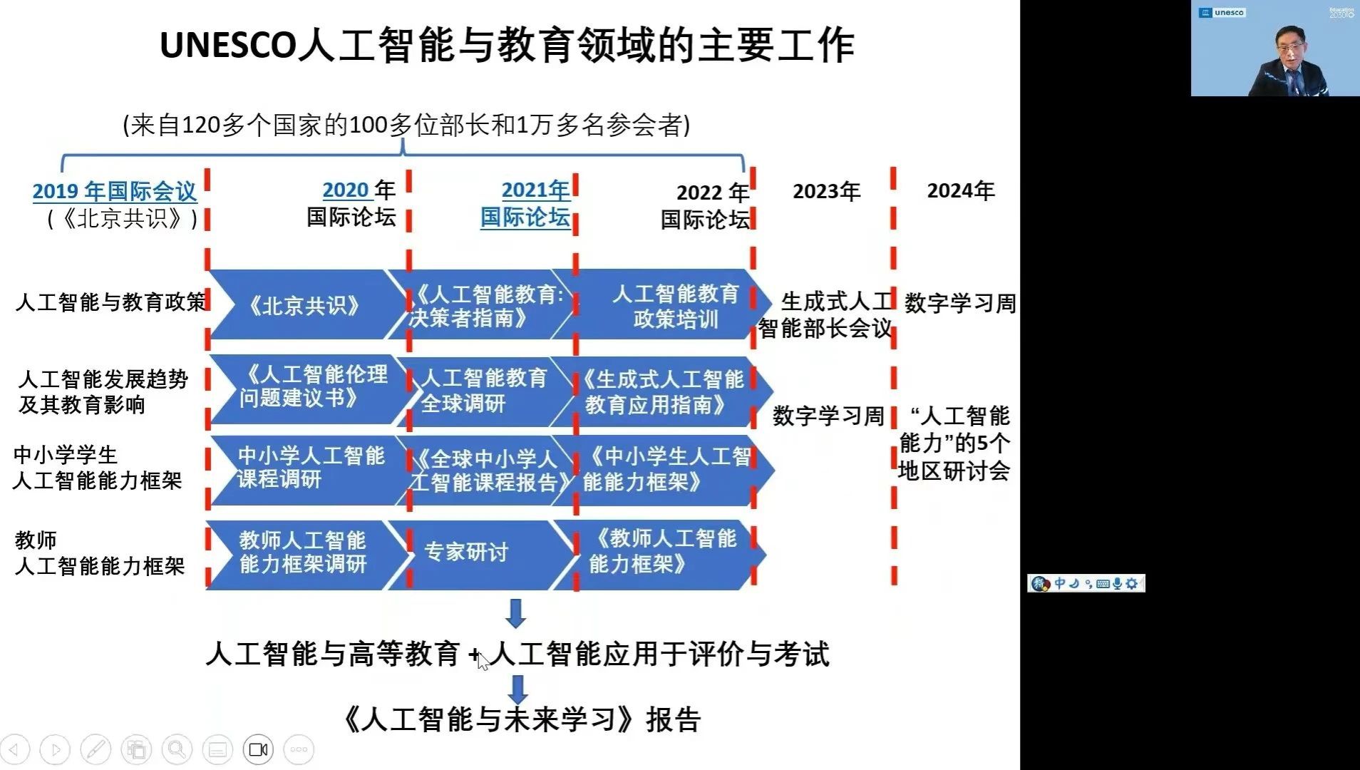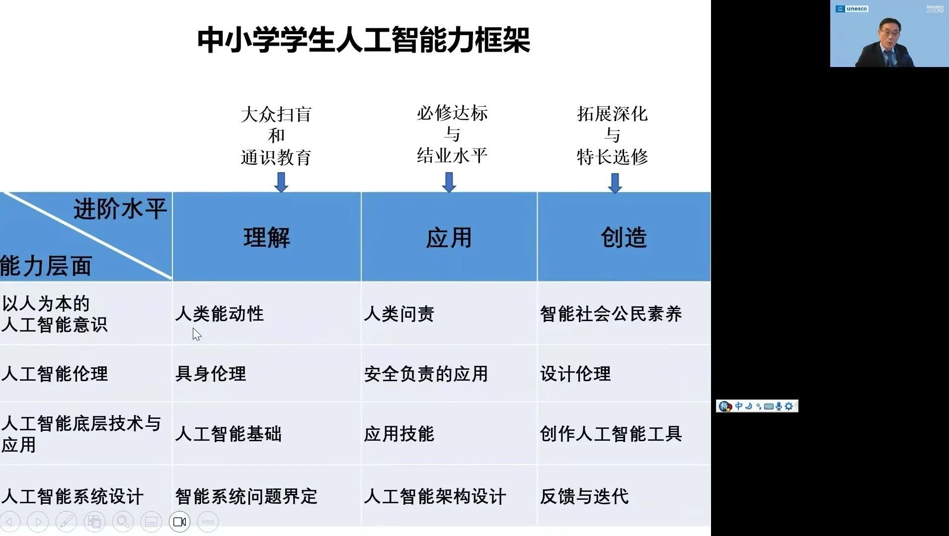 苗逢春博士围绕三个方面展开讲座,一是以人为本的人工智能与教育:政策框架;二是UNESCO全球中小员工人工智能能力框架;三是UNESCO全球中小学教师人工智能能力框架。