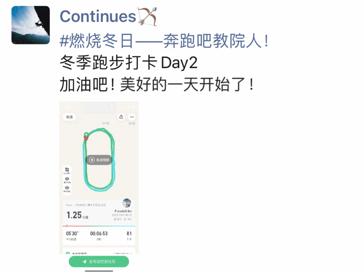 朋友圈文案格式:#燃烧冬日——奔跑吧教院人!冬季跑步打卡Day X+口号+Keep跑步记录截图
