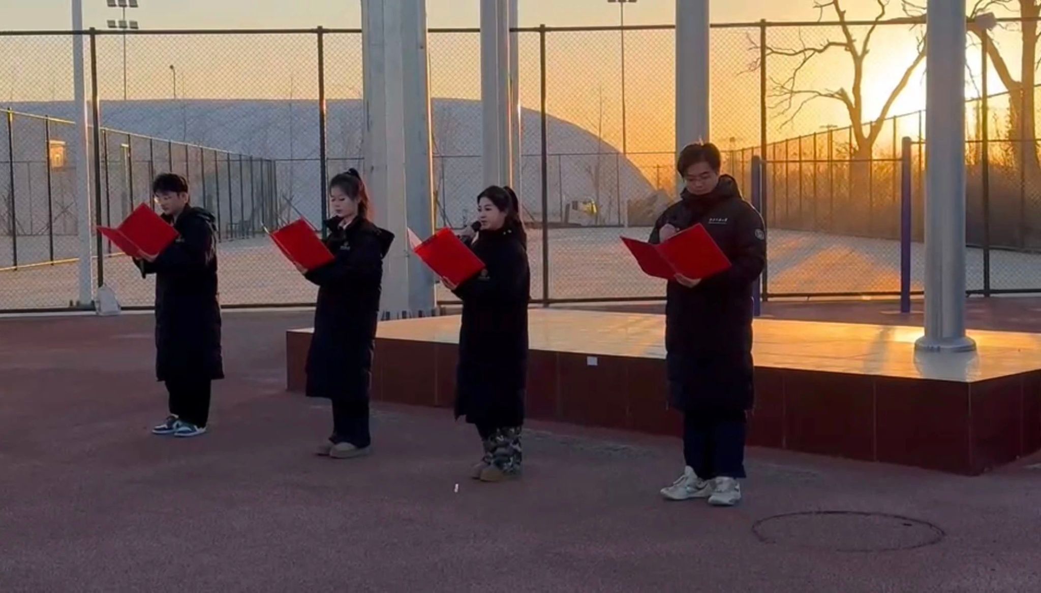 在国旗的见证下,四位2024级本科班同学代表朗诵《延安精神耀千古,民族团结谱新篇》,句句铿锵,无限的热情融在一字一句中。同学们用真挚动人的语言,诉说着对伟大祖国的赤诚热爱,表达着对崇高理想的不懈追求,展现了新时代青年朝气蓬勃的精神风貌,彰显了新时代青年最纯粹深沉的家国情怀。在这片充满希望的热土上,青年学子们正以昂扬的姿态,书写着新时代的青春华章。
