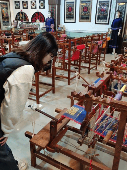 “赴广西壮族自治区靖西市调研壮锦美育传承路径实践团”深入靖西市壮族博物馆、旧州生态博物馆、壮锦厂及多所中小公司开展调研。团队成员针对壮锦技艺的传承现状进行实地考察,以“非遗技艺+数字传播”为切入点,系统分析并总结了靖西壮锦的文化价值与传承现状。在调研过程中,实践团对壮锦技艺的美育价值和时代价值有了更深刻的认识,学习并总结了壮锦文化传承的成果与经验、问题与不足。调研指出,靖西壮锦蕴藏丰富的美育资源,但活态传承面临断层危机:青少年群体普遍对壮锦文化兴趣浓厚,但接触渠道匮乏。针对这一现状,团队联合壮锦技艺传承人开发了美育微课,并构建了“非遗技艺+数字传播”课程体系,为壮锦文化的活态传承与创新传播注入了新活力。