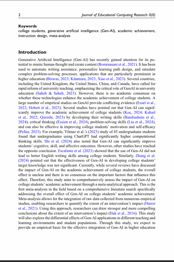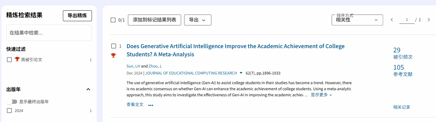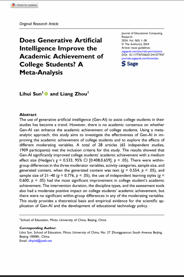 引用来源:Sun,L.,&Zhou,L.(2024).Does generative artificial intelligence improve the academic achievement of college students? A meta-analysis.Journal of Educational Computing Research, 62(7), 1676-1713.https://doi.org/10.1177/07356331241277937