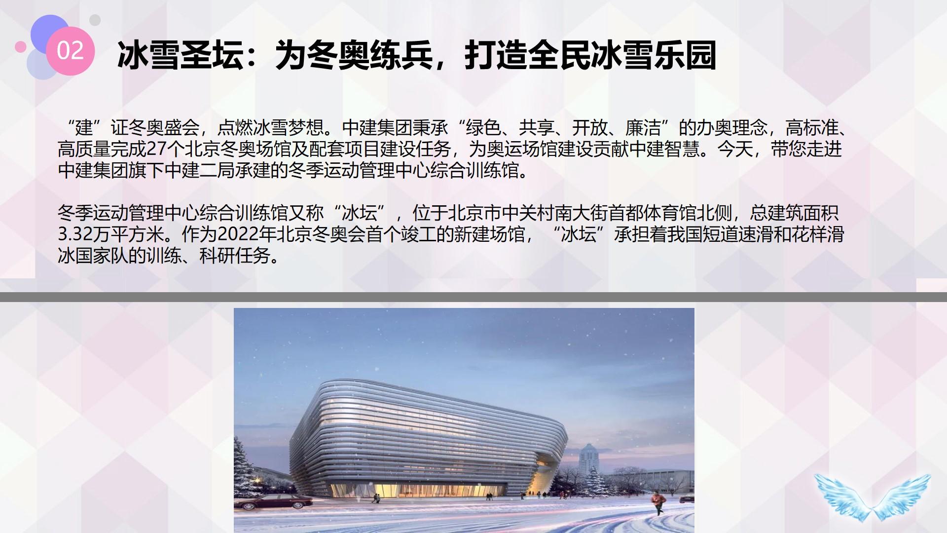 本部分,马小婷同志以“冰雪圣坛”为例介绍了本次奥运的亮点科技奥运。“冰坛”是国内首个拥有两块国际赛事标准冰场的场馆,也是国内首个使用最清洁的天然制冷工质二氧化碳跨临界制冷的综合训练馆。从我国第一块奥运标准冰壶训练场地,到科研医疗康复用房,建设细节无不匹配“奥林匹克”的顶级品质。冬奥会期间,“冰坛”为短道速滑运动员们提供优质的训练场地和有力的保障服务。