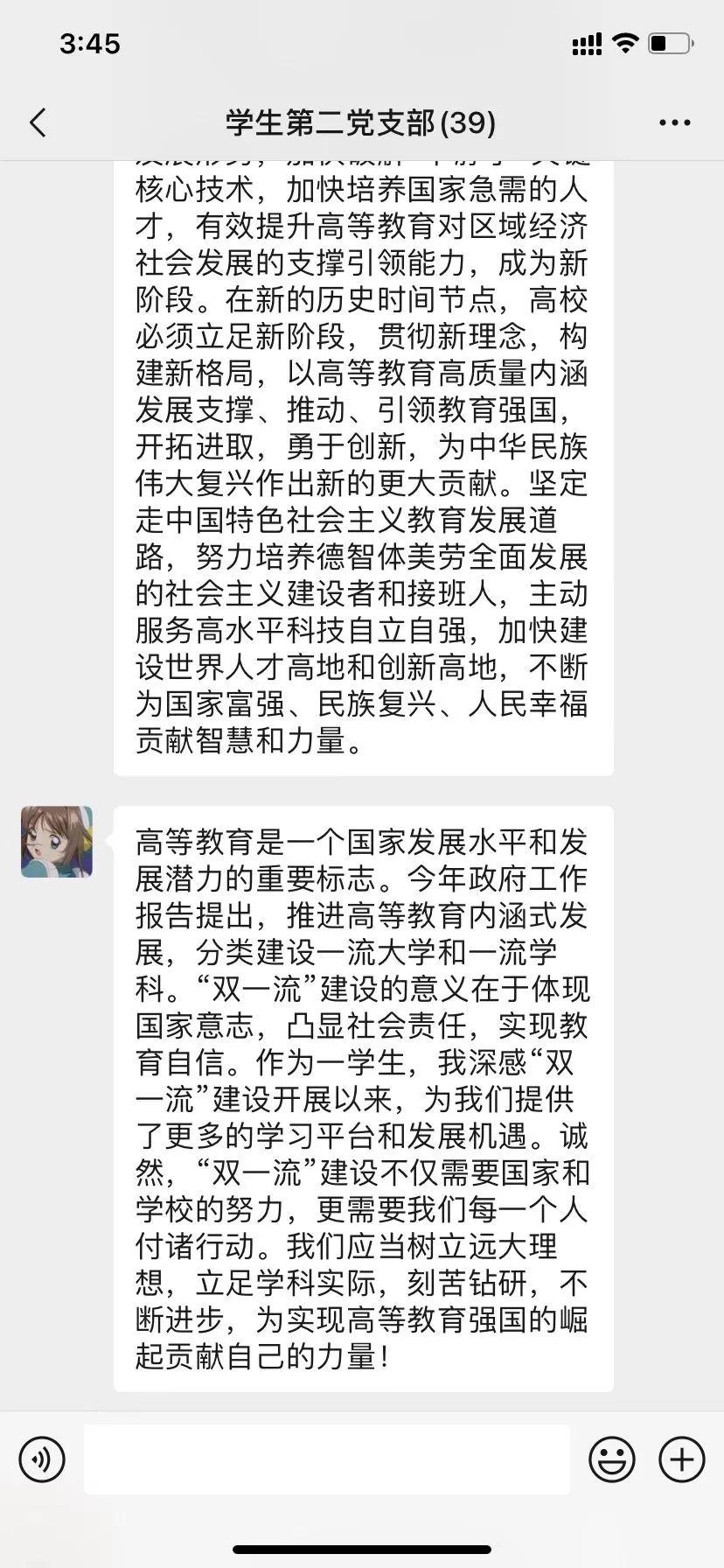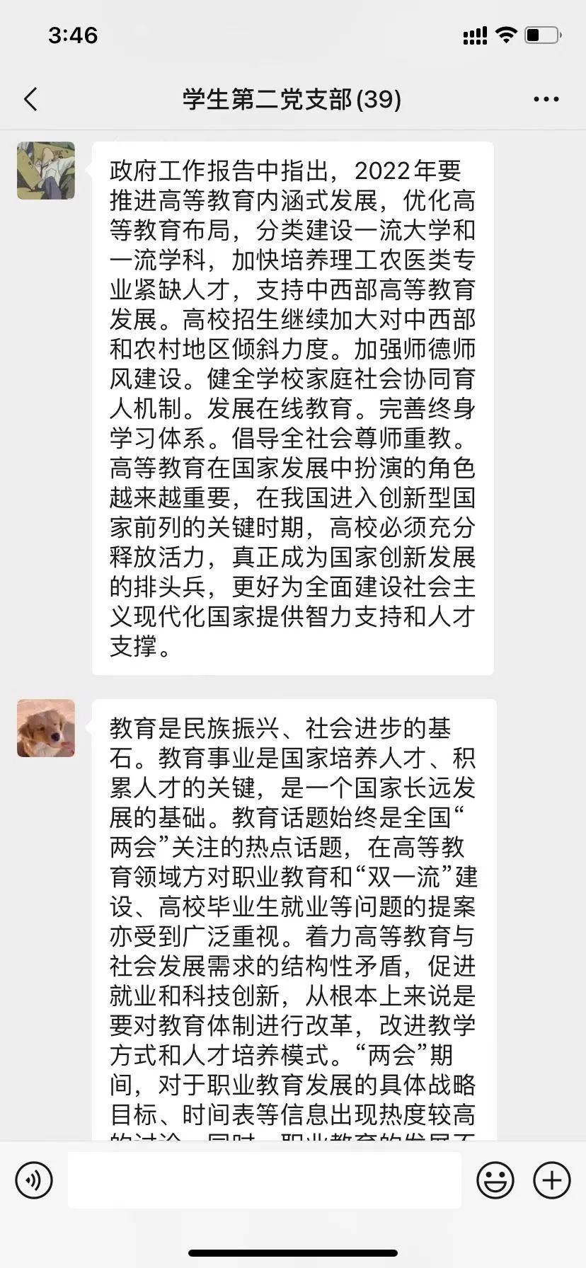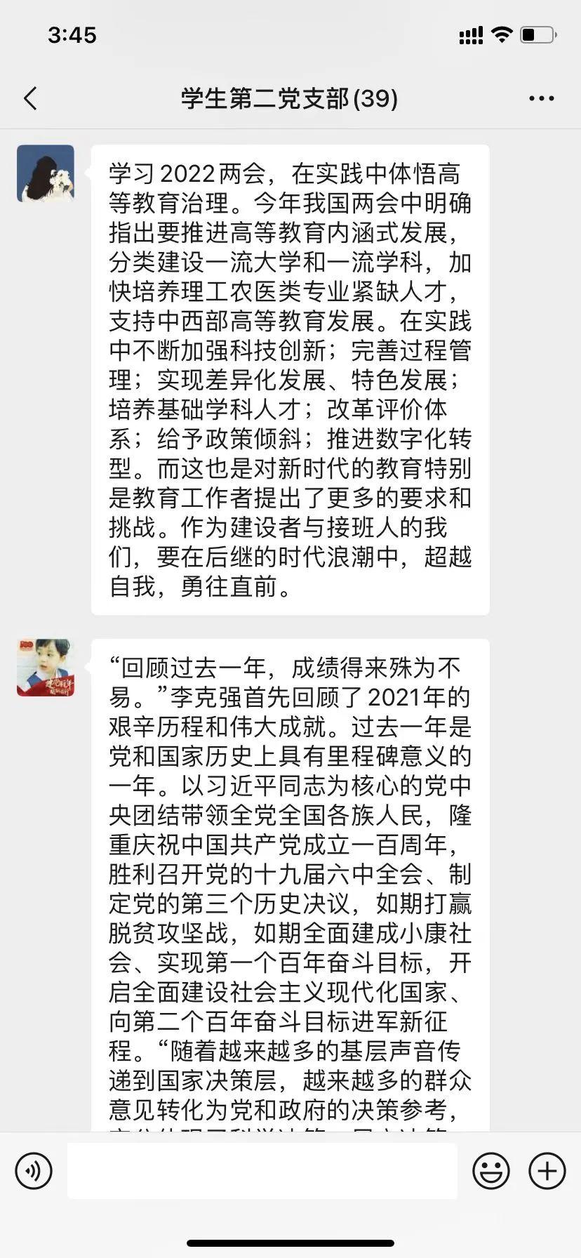 本次党日活动通过集体学习两会内容,共同体悟我国高等教育治理成果,明晰我国下一阶段高等教育发展的工作任务,学习成果丰富深刻,得到了全体成员的积极响应,取得了较为不错的开展成效。