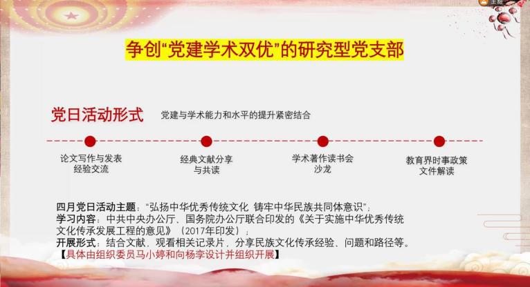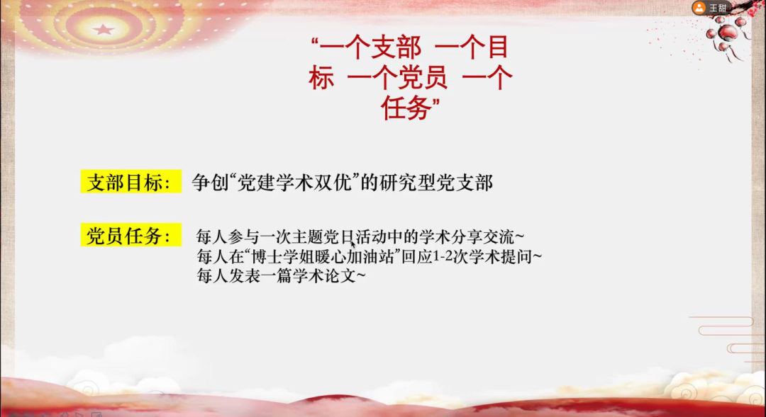 大会第二部分,王甜同志提出支部党员应具备任务意识。支部目标为“争创‘党建学术双优’的研究型党支部”,为实现这一目标,支部内党员应积极完成完成党员的个人任务,如每人参与一次主题党日活动中的学术分享交流、每人在“博士学姐暖心加油站”回应1-2次学术提问、每人发表一篇学术论文。