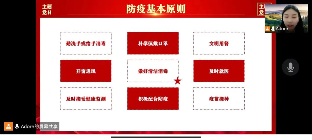 其次,支部全体党员就各自的防疫行动和身边的典型案例展开交流,并在支部群分享各自的防疫行动照片。在本轮防疫过程中,我支部各位党员积极作为,贯彻落实上级和公司以及所在地区疫情防控政策要求,按照防疫基本原则,在校的党员同志积极配合公司多轮全域预防性核酸检测,未返校的党员同志在家自觉做到勤洗手、开窗通风、锻炼身体增强体质,在支部形成凝心聚力、共克时艰的良好氛围。