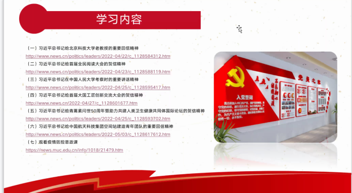 支部全体党员同志共同观看视频,认真学习习近平总书记给北京科技大学老教授重要回信精神、习近平总书记给首届全民阅读大会贺信精神、习近平总书记在中国人民大学考察时重要讲话精神、习近平总书记给首届大国工匠创新交流大会贺信精神等系列讲话精神。