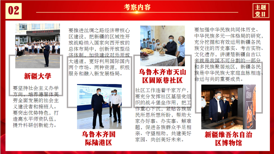 随后,向杨孪同志带领各位同志深入地学习了习近平总书记对新疆大学、乌鲁木齐国际陆港区、乌鲁木齐市天山区固原巷社区和新疆维吾尔自治区博物馆等地的调研内容。