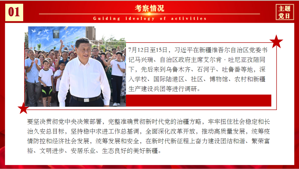 为响应谈球吧教育公司党委的统一部署和具体要求,深刻领会习近平总书记在新疆考察时的重要讲话精神,2022年7月31日员工第一党支部开展了“学习习近平总书记在新疆考察时重要讲话精神”的主题党日活动。