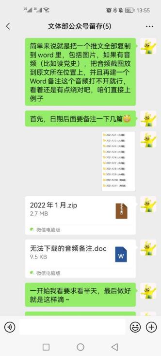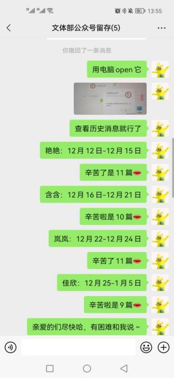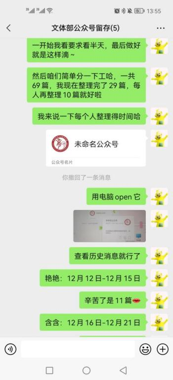 1.协助宣传部整理2020年11、12月的推送材料。2月28日至3月3日,文体部快速且有质量地完成了此项工作。