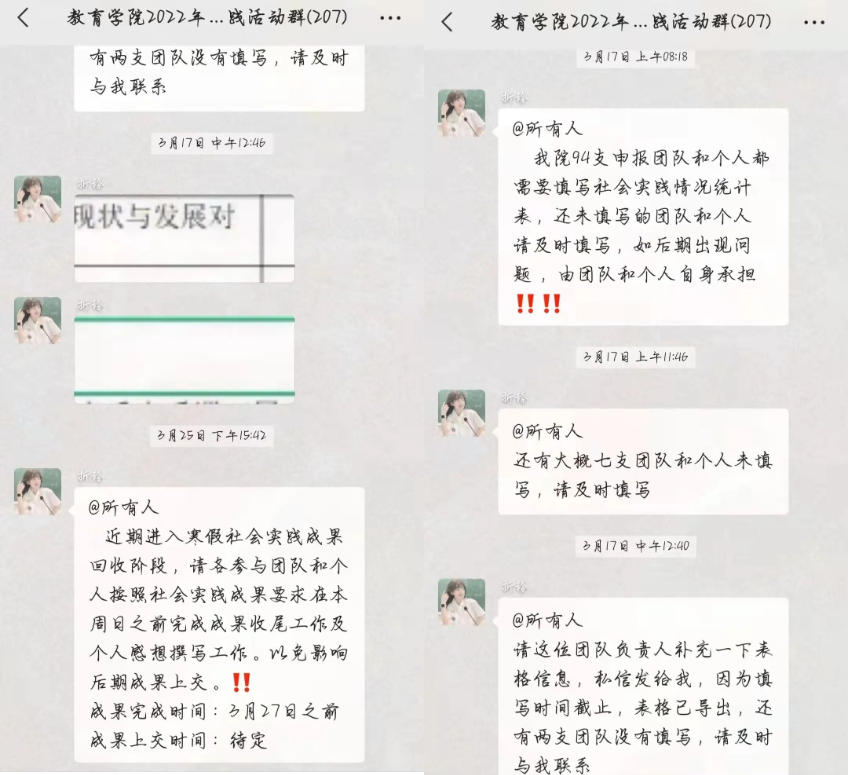 2022年3月中旬至下旬,团委科创实践部2022年寒假社会实践成果回收工作陆续开展。团委科创实践部部长折玲对寒假社会实践成果回收的要求以及相关注意事项进行整理并发布在谈球吧官方网站2022年寒假社会实践群中,此次资料及相关要求的发布为后续寒假社会实践成果回收与评比工作的开展奠定基础。