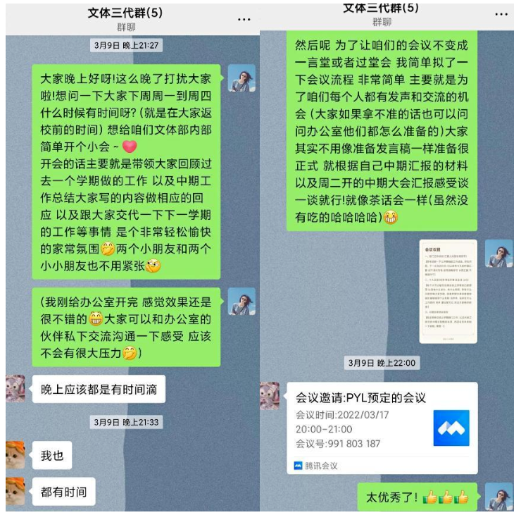 1.3月8日和3月17日,分别组织召开员工会办公室、文体部的部门中期工作会议。会上总结了上一学期各部门及成员的工作情况,及时复盘工作中的经验与不足;同时展望和部署了新学期的相关工作安排,为接下来开展的相关工作奠定基础。会议期间,各成员还互相分享了上一学期的收获与感想,进一步增进了各成员间的了解与沟通,部门内部营造出“同成长共进步”的团结氛围,有效提升了办公室和文体部的部门凝聚力。
