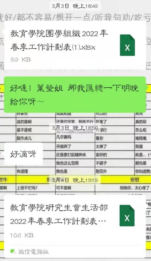 3月,由于谈球吧官方网站公众号的更新等事宜,需要将以往推文进行备份汇总,文体部所有成员参与此次汇总工作并按时完成。