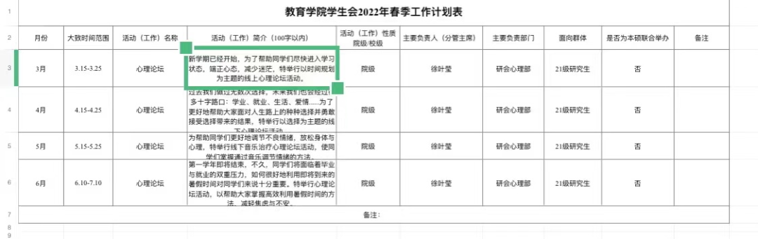 3.汇总整理谈球吧官方网站研究生会2022年春季工作计划表并留档。