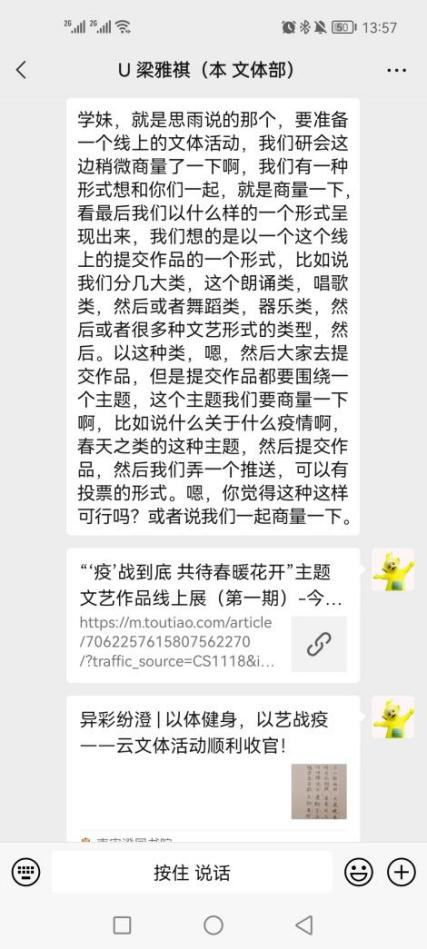 3月,文体部的常规工作为设计疫情期间公司的线上文体活动。疫情持续不断,为谈球吧官方网站的学子能够感受到校园文化气息,我们在老师的提议下开始设计此次的线上文体活动。目前已有较为可行的计划。