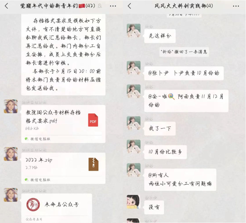 因公司公众号更换,研究生会需整理2021年旧公众号发出的推送,由宣传部统筹负责。我部首先汇总了年度总发出的推送数量,按照各部门人数分配任务。其中五月份的推送由我部进行整理,所有部门整理结束,汇总至我部进行最后的整合,并发送给公司新旧公众号汇总的负责人。