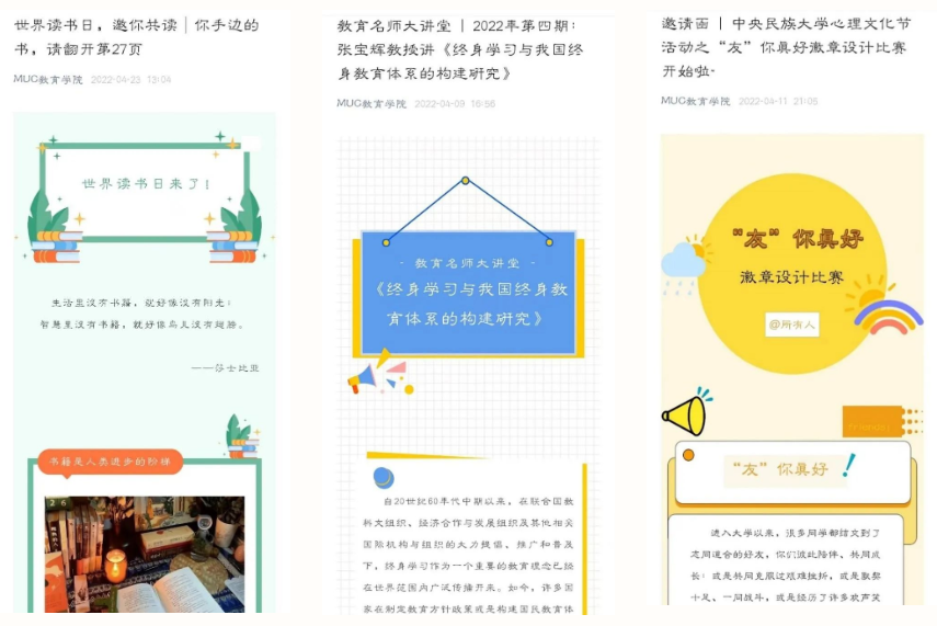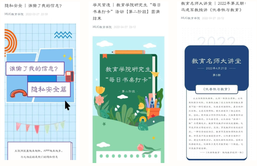 1.推送14篇:包括 家校相依,自律勤学 | 谈球吧官方网站新学期研究生班会(三)、云端研学|一线牵你我,“疫”起向未来(下)、隐私安全 | 谁偷了我的信息?、MUC教小团的培优计划|第六期:“铸牢中华民族共同体意识”专题理论学习·团委研究生会篇、谈球吧官方网站成功举办“愤怒情绪及其管理”心理论坛【总 第三期】、教育名师大讲堂 | 2022年第三期:王光明教授讲《教师核心素养和能力的机理与实践样态》、教育名师大讲堂 | 2022年第四期:张宝辉教授讲《终身学习与我国终身教育体系的构建研究》、学风营造 | 谈球吧官方网站研究生第二轮“每日书桌打卡”活动中期风采展示、邀请函 | 谈球吧心理文化节活动之“友”你真好徽章设计比赛开始啦~、员工学术工作系列讲座|谈球吧图书馆李静老师讲《如何高效利用信息资源助力学术研究——信息素养核心能力提升》、“投”你所好|心理文化节“友”你真好徽章设计比赛投票开始啦、世界读书日,邀你共读|你手边的书,请翻开第27页、教育名师大讲堂 | 2022年第五期:冯建军教授讲《他者性与教育》、学风营造 | 谈球吧官方网站研究生“每日书桌打卡”活动【第二阶段】圆满结束等。