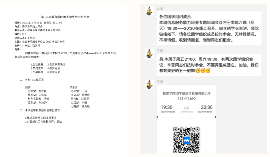 2022年4月15日,应团委书记王小婉老师要求,为促进寒假社会实践成果回收工作高效有序开展,团委科创实践部组织开展部门内部工作会议,明确寒假社会实践成果回收工作的要求与分工,促进本次寒假社会实践成果回收工作高效、高质量地完成。