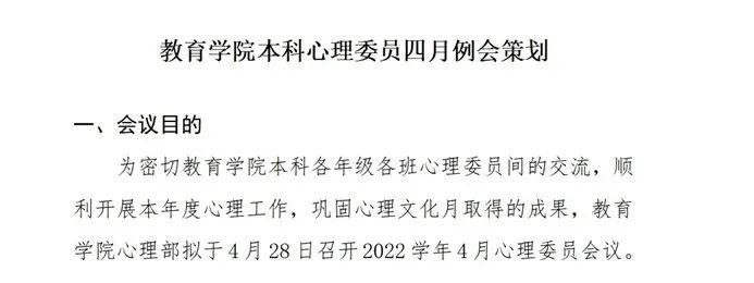 3.4月21日带领心理部撰写四月本科生心理委员例会策划并进行审核。