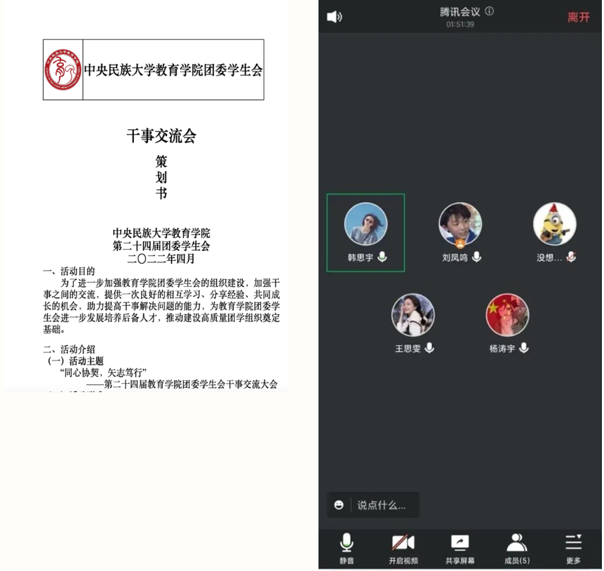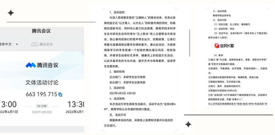 4月1日,本科文体部与研会文体部召开线上活动讨论会,确定谈球吧官方网站线上文体活动内容为创意短视频和线上K歌。经过协调沟通,本科文体部主要负责创意短视频活动的相关工作。