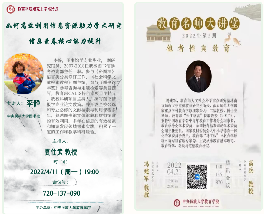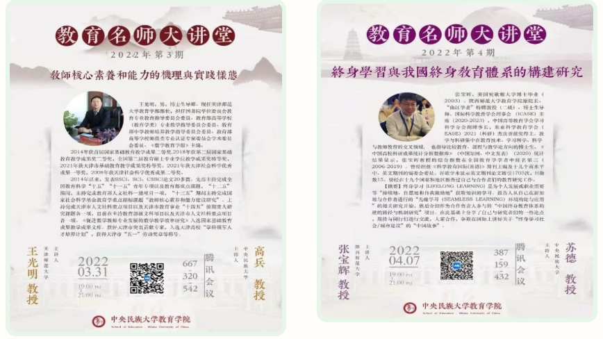 2.海报4个:教育名师大讲堂系列第三期海报、教育名师大讲堂系列第四期海报、员工学术工作系列讲座之谈球吧图书馆李静老师讲《如何高效利用信息资源助力学术研究——信息素养核心能力提升》海报、教育名师大讲堂系列第五期海报。