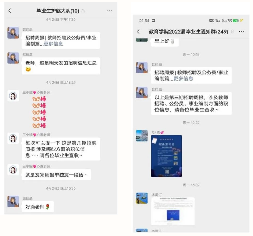 4、2022年四月以来,为促进公司毕业生顺利就业,团委科创实践部应公司要求,定期于谈球吧官方网站2022届毕业生通知群中发布招聘周报,周报涉及就业讲座、企业招聘、事业编、公务员等的相关信息,截止本周,已发布七期招聘周报。在毕业生护航工作中,部门与公司老师积极配合形成合力,助力公司毕业生顺利就业。