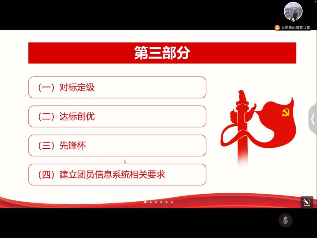 随后,由办公室主任肖恩慧进行团支部评优标准和团员信息库建设两项工作介绍。其中,对于团支部评优标准的细则进行详细说明,为大家讲解“对标定级”“达标创优”中的具体要求及评选步骤。