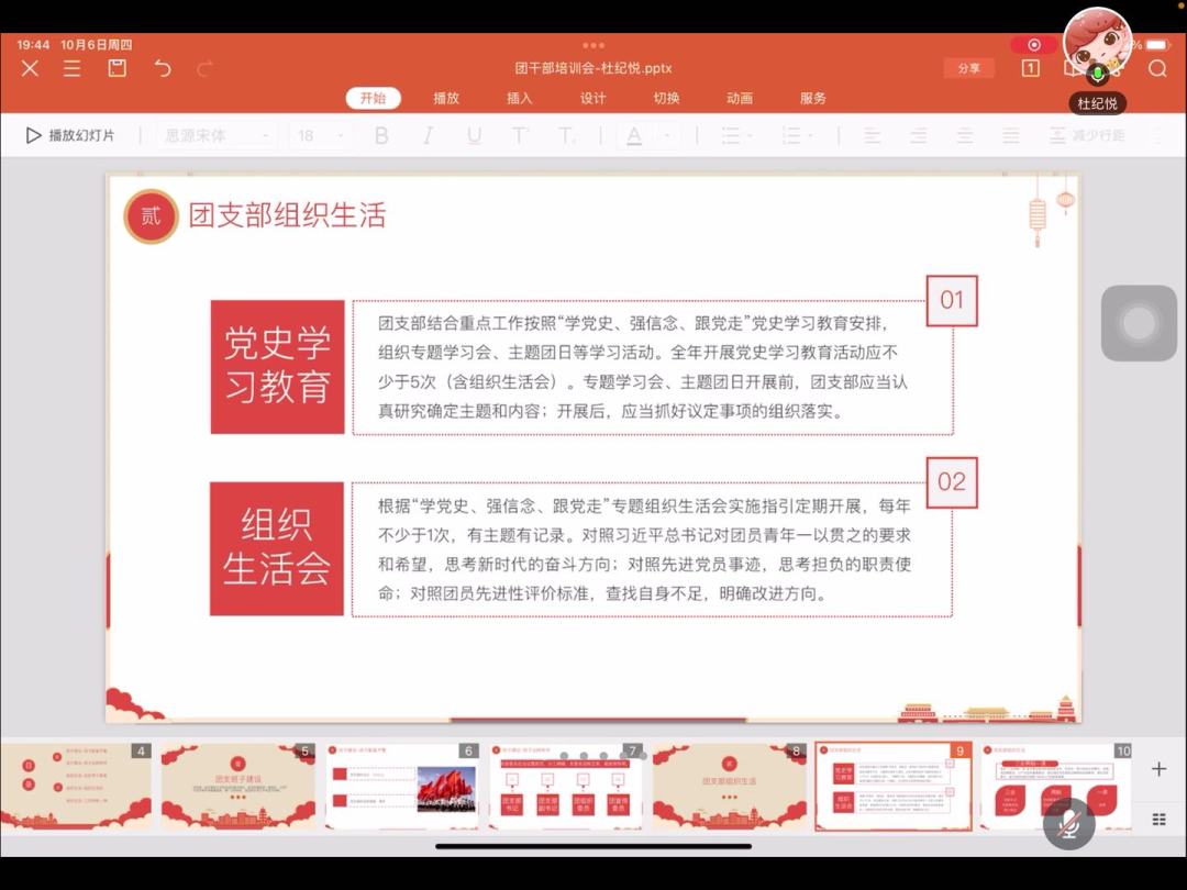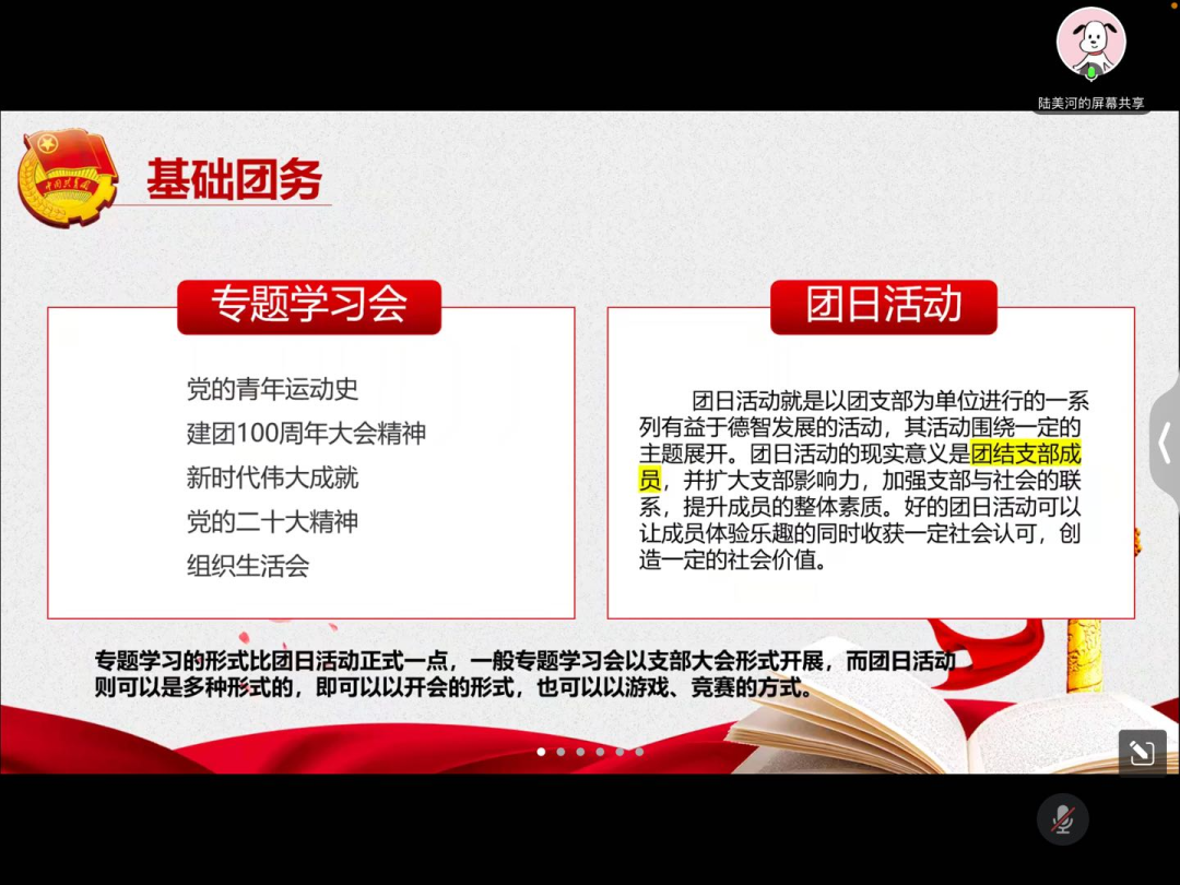 紧接着,团委副书记杜纪悦分别从班子建设、组织生活两个方面进行基层团支部介绍,详细介绍了团支部书记、组织委员、宣传委员的职责和组织生活会、党史学习教育、三会两制一课的具体内涵,并讲解了团支部的常规工作。