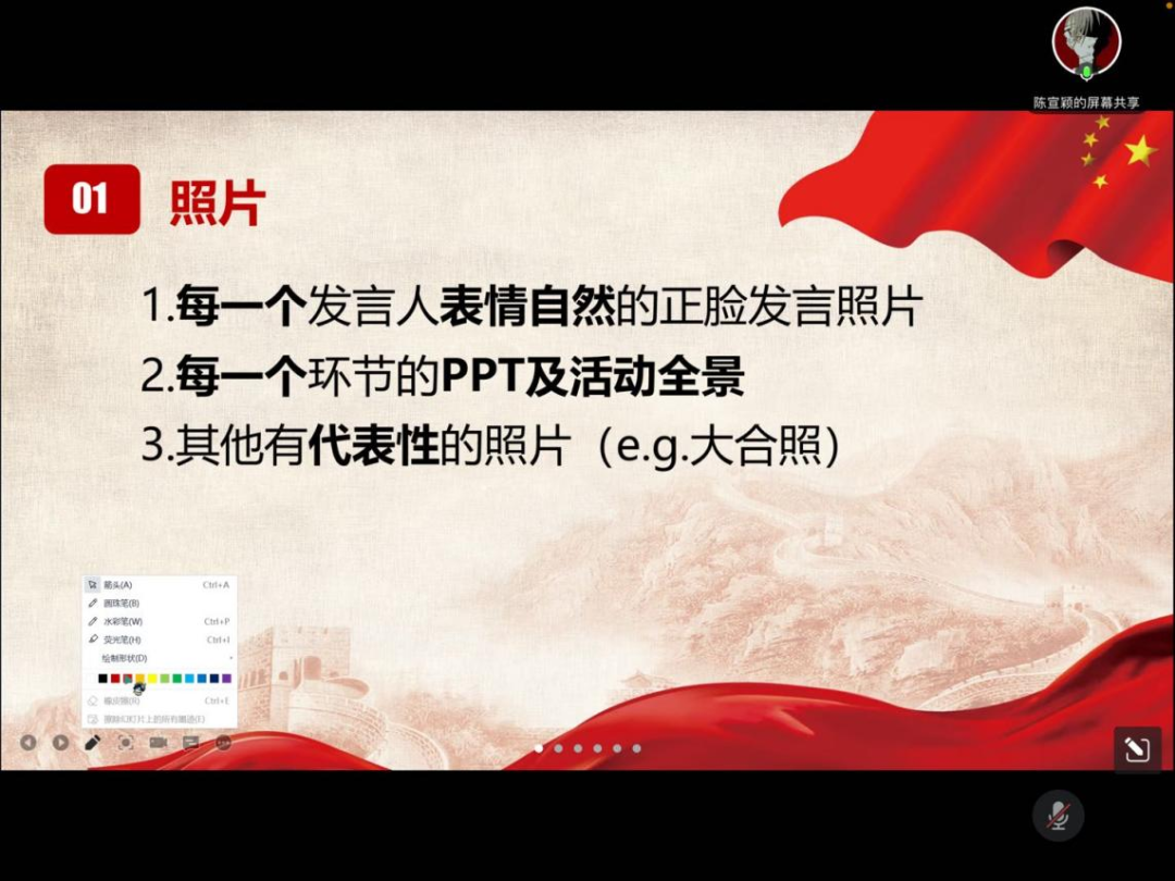 宣传部部长陈宣颖向大家讲解宣传工作事宜,详细说明材料提交要求与团的标识使用规范,包括图文格式、命名排版和活动照片摄影用作素材的注意事项等。此外,她还特别强调要规范使用团旗、团歌、团徽,注意使用场景和使用格式。