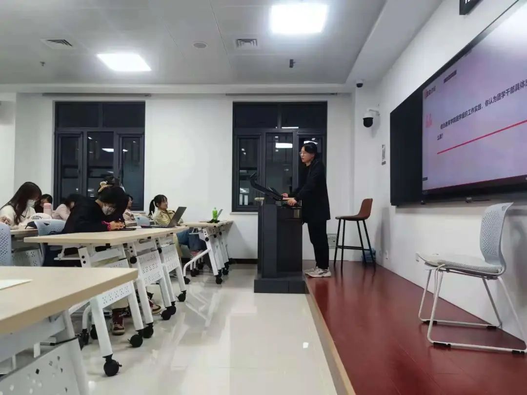 主讲人杨涛宇在团学组织中随机抽取部门,现场提问培优测试题。所抽取部门回答测试题的正确率均为100%,反映出在此次培优中,团学成员能够认真学习文件精神,学有所获、学有所得。